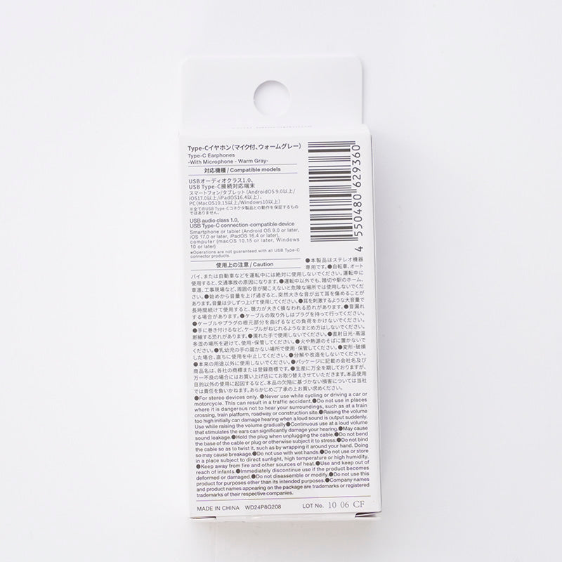 型式:ダイナミック型ドライバー:Φ10mm出力音圧レベル:104±3dB再生周波数帯域:20Hz〜20000Hzインピーダンス:16Ω対応ビット数/サンプリングレート:最大16bit/48kHzコネクタ:USB Type-Cプラグケーブル長さ:約1.2m(Y型)マイク部特性マイク周波数特性:100Hz〜10000Hz指向特性:全指向感度:-42±3dB対応機種:USBオーディオクラス1.0、USB Type-C接続対応端末スマートフォン/タブレット(AndroidOS 9.0以上/iOS17.0以上/iPadOS16.4以上)、PC(MacOS10.15以上/Windows10以上)※全てのUSB Type-Cコネクタ製品との動作を保証するものではありません。センターボタンの操作1回押す:音楽の再生、停止/着信時の受話、終話2回押す:曲送り長押し:音声アシスタント起動機種やアプリケーションによってはリモコン操作が使用できない場合があります。センターボタンボリュームボタン(+)ボリュームボタン(―)●本製品はステレオ機器専用です。●音漏れする場合があります。●ケーブルやプラグの根元部分を曲げるなどの負荷をかけないでください。●手に巻き付けるなど、ケーブルがねじれるようなまとめ方はしないでください。断線する恐れがあります。●自転車、オートバイ、または自動車などを運転中には絶対に使用しないでください。運転中に使用すると、交通事故の原因になります。●運転中以外でも、踏切や駅のホーム、車道、工事現場など、周囲の音が聞こえないと危険な場所では使用しないでください。●耳を刺激するような大音量で長時間続けて使用すると、聴力が大きく損なわれる恐れがあります。●ケーブルの取り外しはプラグを持って行ってください。●濡れた手で使用しないでください。●直射日光・高温多湿の場所を避けて、使用・保管してください。●火や熱源のそばに置かないでください。●乳幼児の手の届かない場所で使用・保管してください。●変形・破損した場合、直ちに使用を中止してください。●分解や改造をしないでください。●本来の用途以外に使用しないでください。●パッケージに記載の会社名及び商品名は、各社の商標または登録商標です。●生産に万全を期しておりますが、万一不良の場合にはお買い上げ店にてお取り替えさせていただきます。本品使用目的以外の使用に起因するなど、本品の欠陥に基づかない損害については当社では責任を負いかねます。あらかじめご了承の上お買い求めください。●始めから音量を上げ過ぎると、突然大きな音が出て耳を傷めることがあります。音量は少しずつ上げて使用してください。