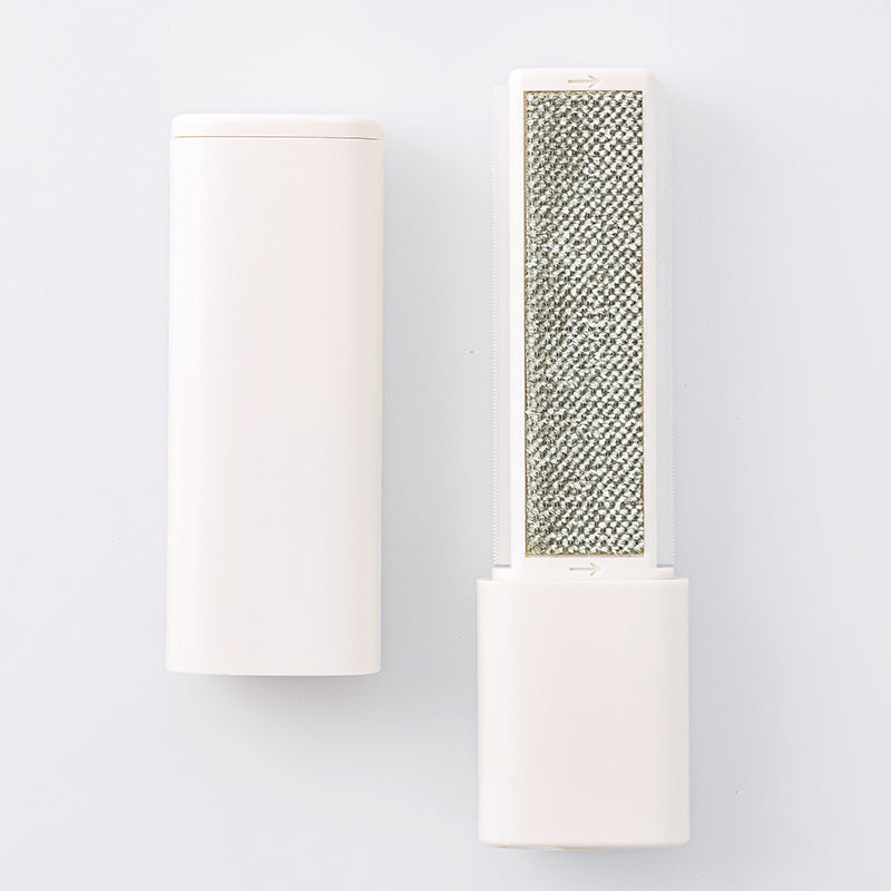 衣類やカーペットなどのホコリ、髪の毛、ペットの毛、毛玉が取れるリントブラシです。 たまったホコリを捨ててくり返し使えます。ケースのキャップ ホコリやゴミが溜まった場合は、蓋を取り外して捨ててください。 正面:ホコリ取り 衣類やカーペットに軽くあて、矢印の方向にスライドしてください。本体をケースに差し込み、数回往復させるとホコリやゴミがケース底部に溜まります。 側面:毛玉取り 衣類やカーペットに軽くあてスライドしてください。毛玉が溜まった場合は、手で取り除いてください。●お子様の手の届かない場所に保管してください。●直射日光・高温多湿の場所を避けて、保管してください。素材によっては衣類などが痛む恐れがあります。目立たない部分で試してから使用してください。 デリケートな素材には使用しないでください。 衣類などの素材によっては、ホコリやゴミ、毛玉が取れない場合があります。 素材の特性上、経年劣化により変色する可能性があります。●変形・破損した場合、直ちに使用を中止してください。●火や熱源のそばに置かないでください。●本来の用途以外に使用しないでください。