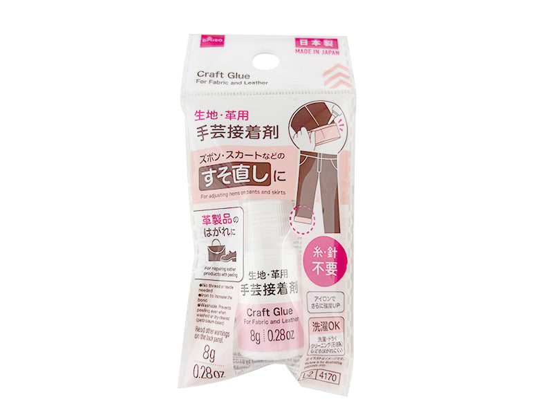8g●イラストはイメージです。ズボン・スカートなどのすそ直しに革製品のはがれに糸・針不要アイロンでさらに強度UP洗濯OK洗濯・ドライクリーニング(石油系)してもはがれにくい●ストレッチ素材にも使用できる●外出先でも使用できる種類/水性形接着剤用途/布、革などの接着〈接着できないもの〉●薄手の生地(シミの原因になります) ●撥水布、過剰な柔軟剤処理をした素材 ●特殊加工を施した生地 ●ポリプロピレン、ポリエチレン、フッ素樹脂、シリコーン樹脂 ●表面がツルツルした素材 ●金属●目立たない部分で試してから使用してください。●ヘラなどを使用し、生地同士をはり合わせてしばらく押さえてください。●アイロンを使用する場合は、適切な量を塗布し、必ずあて布をしてください。※塗布不足、圧着不足によりはがれる場合があります。※接着部の温度が下がるまで動かさないでください。※必要以上のアイロン接着は焦げや変色の原因になります。※アイロン後、生地に染み込んだ接着剤は取り除けません。本品を凍結させないでください。温度5℃ー40℃の場所で使用・保管してください。●キャップを閉めて保管してください。お子様の手の届かないところに置き、いたずらをしないように注意してください。 目に入った場合は、流水で15分以上洗い流してください。 皮膚についた場合は、石鹸と水で洗い流してください。 口に入れないでください。飲み込んだ場合は、直ちに医師に連絡してください。 接着用以外には使用しないでください。 アイロンを使用する際は、やけどに注意してください。 裏ぬけしてしまうほどの薄い生地に使用すると、シミの原因になります。生地に染み込んだ接着剤は取り除けません。●火や熱源のそばに置かないでください。