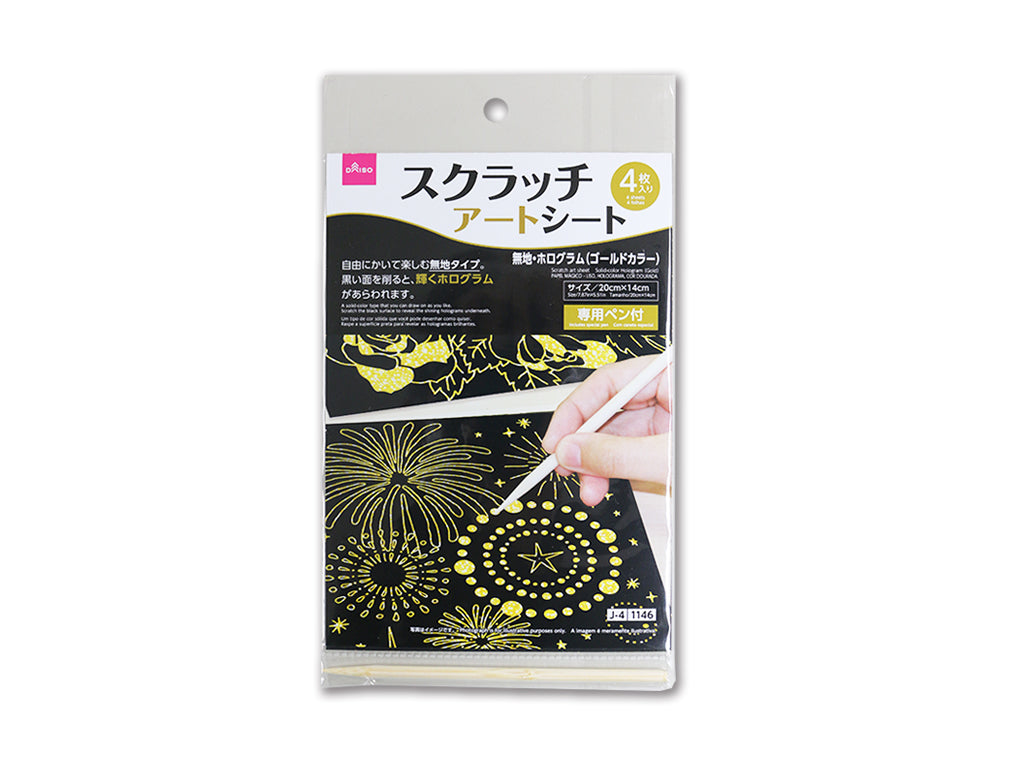 専用ペン付 シート4枚入り自由にかいて楽しむ無地タイプ。付属の専用ペンで黒い面を削ると、輝くホログラムがあらわれます。 好きな文字やイラストをかいたり、好きなサイズ・形に切ったりして楽しみましょう。付属の専用ペンは先がとがっています。取り扱いに注意してください。 専用ペンを人に向けたり、目を突いたりしないでください。●玩具ではありません。●乳幼児の手の届かない場所で使用・保管してください。●火や熱源のそばに置かないでください。●本来の用途以外に使用しないでください。