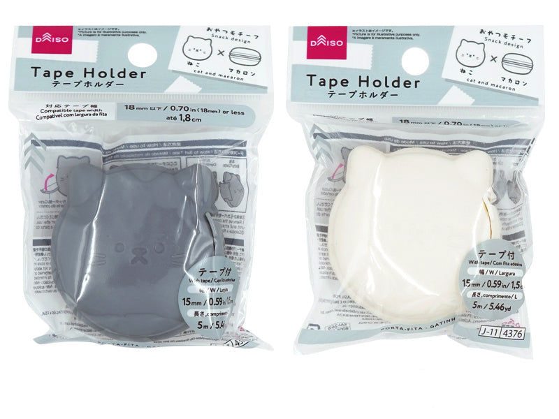 ●イラストはイメージです。おやつモチーフ ねこ × マカロン、テープ付、幅:15mm、長さ5m、対応テープ幅:18mm以下、対応サイズ 【テープ】 テープ幅:18mm以下、内径:25mm以上、外径:45mm以下 テープの取り付け方法 ①本体からカバーを外します。 ②本体にテープをセットし、カバーを取り付けます。 使用後はカッター部を閉じてください。 ●テープの種類によっては切れにくい場合があります。 ●カッター部は尖っていますので注意してください。●直射日光・高温多湿の場所を避けて、使用・保管してください。●乳幼児の手の届かない場所で使用・保管してください。●無理な力や強い衝撃を与えないでください。●変形・破損した場合、直ちに使用を中止してください。●火や熱源のそばに置かないでください。●本来の用途以外に使用しないでください。