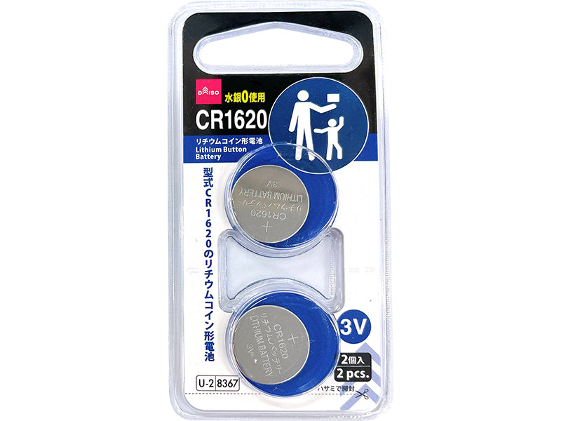 型式CR1620のリチウムコイン形電池電子機器などに 2個入 水銀0使用●他の電池や金属製の物と一緒に保管・携帯しない。保管・廃棄の際はテープ等を巻いて絶縁する。●お子様やペットの手の届かない場所に保管してください。取り扱い注意●誤った電池の使い方や、保存環境によって発熱、破裂、液漏れ、機器の故障、ケガの原因となりますので、必ず下記のことを守ってください。●ショート、分解、加熱、充電、プラス、マイナス逆接続、新旧、異種電池混用、火に入れる、水や液体で濡らす、強い衝撃、変形させる等は厳禁。使い切った電池はすぐに機器から取り出してください。●開封時・開封後は切断面でケガをしないように注意する。●万一、電池からもれた液が目に入ったときはすぐに大量の水で洗い、医師に相談してください。皮膚や服に付いたときは水で洗ってください。●本来の用途以外に使用しないでください。●コイン電池は飲み込むと死に至る恐れがあるので、大変危険です。●万一飲み込んだ場合は、すぐに医師に相談してください。