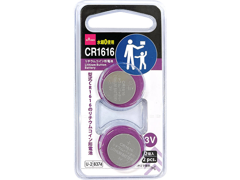 型式CR1616のリチウムコイン形電池電子機器などに 2個入 水銀0使用●他の電池や金属製の物と一緒に保管・携帯しない。保管・廃棄の際はテープ等を巻いて絶縁する。●お子様やペットの手の届かない場所に保管してください。取り扱い注意●誤った電池の使い方や、保存環境によって発熱、破裂、液漏れ、機器の故障、ケガの原因となりますので、必ず下記のことを守ってください。●ショート、分解、加熱、充電、プラス、マイナス逆接続、新旧、異種電池混用、火に入れる、水や液体で濡らす、強い衝撃、変形させる等は厳禁。使い切った電池はすぐに機器から取り出してください。●開封時・開封後は切断面でケガをしないように注意する。●万一、電池からもれた液が目に入ったときはすぐに大量の水で洗い、医師に相談してください。皮膚や服に付いたときは水で洗ってください。●本来の用途以外に使用しないでください。●コイン電池は飲み込むと死に至る恐れがあるので、大変危険です。●万一飲み込んだ場合は、すぐに医師に相談してください。