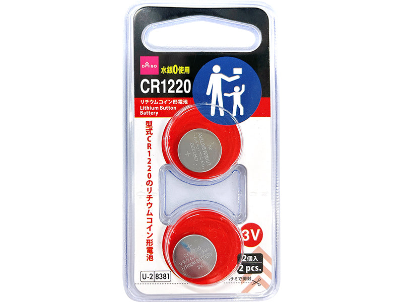 型式CR1220のリチウムコイン形電池電子機器などに 2個入 水銀0使用●他の電池や金属製の物と一緒に保管・携帯しない。保管・廃棄の際はテープ等を巻いて絶縁する。●お子様やペットの手の届かない場所に保管してください。取り扱い注意●誤った電池の使い方や、保存環境によって発熱、破裂、液漏れ、機器の故障、ケガの原因となりますので、必ず下記のことを守ってください。●ショート、分解、加熱、充電、プラス、マイナス逆接続、新旧、異種電池混用、火に入れる、水や液体で濡らす、強い衝撃、変形させる等は厳禁。●使い切った電池はすぐに機器から取り出してください。●開封時・開封後は切断面でケガをしないように注意する。●万一、電池からもれた液が目に入ったときはすぐに大量の水で洗い、医師に相談してください。皮膚や服に付いたときは水で洗ってください。●本来の用途以外に使用しないでください。●コイン電池は飲み込むと死に至る恐れがあるので、大変危険です。●万一飲み込んだ場合は、すぐに医師に相談してください。