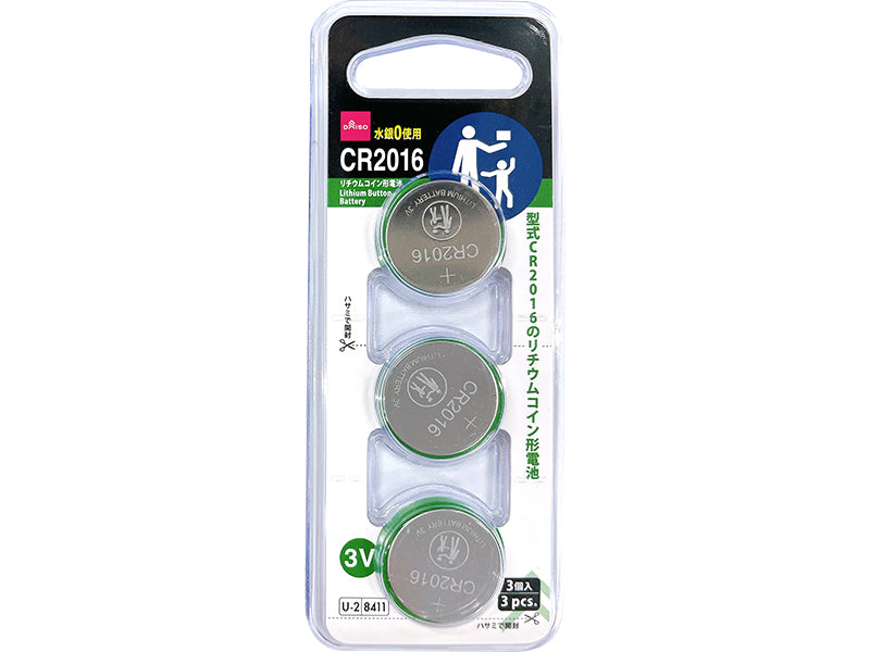 型式CR2016のリチウムコイン形電池電子機器などに 3個入 水銀0使用●他の電池や金属製の物と一緒に保管・携帯しない。保管・廃棄の際はテープ等を巻いて絶縁する。●お子様やペットの手の届かない場所に保管してください。取り扱い注意●誤った電池の使い方や、保存環境によって発熱、破裂、液漏れ、機器の故障、ケガの原因となりますので、必ず下記のことを守ってください。●ショート、分解、加熱、充電、プラス、マイナス逆接続、新旧、異種電池混用、火に入れる、水や液体で濡らす、強い衝撃、変形させる等は厳禁。●使い切った電池はすぐに機器から取り出してください。●開封時・開封後は切断面でケガをしないように注意する。●万一、電池からもれた液が目に入ったときはすぐに大量の水で洗い、医師に相談してください。皮膚や服に付いたときは水で洗ってください。●本来の用途以外に使用しないでください。●コイン電池は飲み込むと死に至る恐れがあるので、大変危険です。●万一飲み込んだ場合は、すぐに医師に相談してください。