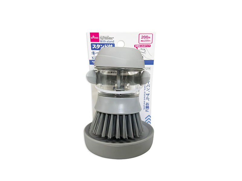 ワンプッシュでブラシから洗剤が出る! スタンド付●イラストはイメージです。耐熱温度:60℃ フタを回転させてディスペンサー部を開け、洗剤を入れます。 フタの内側の中心にプッシュ棒がはまっている事を確認してからフタを閉めます。本体を傾けた状態でボタンを押すと洗剤が出ない可能性があります。洗剤を出す際は垂直にして、ボタンの中心をまっすぐ押してください。 洗剤が出ない場合や液もれする場合は、再度確認してからフタを閉めなおしてください。 中身が減ると洗剤の出が悪くなることがあります。その際は洗剤を補充してください。 本品は密閉容器ではありません。横倒しにすると洗剤が漏れる場合があります。 液体の粘度によりスムーズに使用できない場合があります。●キズのつきやすいものに使用しないでください。●目立たない部分で試してから使用してください。●塩素系、酸素系の漂白剤、d-リモネンを含む洗剤は使用しないでください。●長期間中身を入れたままにしないでください。●火や熱源のそばに置かないでください。●本来の用途以外に使用しないでください。●生産に万全を期しておりますが、万一不良の場合にはお買い上げ店にてお取り替えさせていただきます。本品使用目的以外の使用に起因するなど、本品の欠陥に基づかない損害については当社では責任を負いかねます。あらかじめご了承の上お買い求めください。●レモンなど柑橘類の皮に含まれるテルペンや、油脂によって変質することがあります。