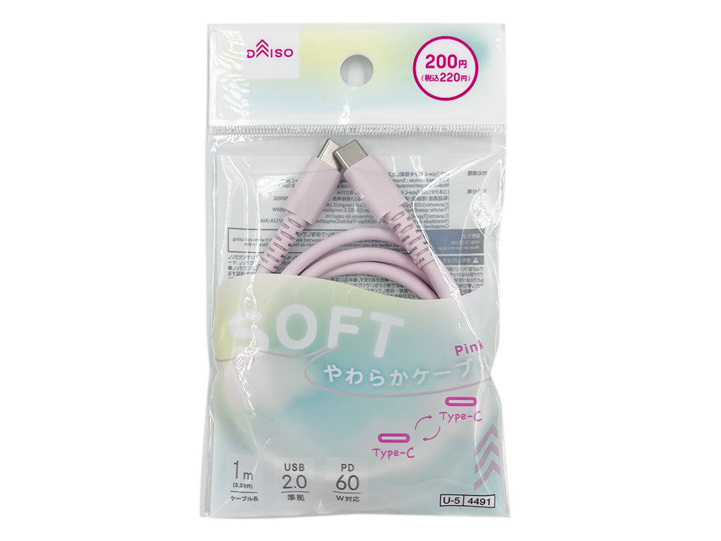 SOFT やわらかケーブルPink Type-C Type-C 長さ 1m(3.28ft) USB2.0準拠 PD60W対応 Soft USB CtoC Cable White 対応機種 USB Type-C 端子を搭載したスマートフォン、タブレット、パソコンなど製品仕様 コネクタ USB Type-C to USB Type-C ケーブル長 1m 転送速度(理論値) 最大480Mbps 規格 USB2.0規格準拠 5V 12A 最大 PD60W対応使用しない場合は電源や接続機器から抜いて保管してください。 ●無理にひっぱったり、曲げたり、重いものを上に載せないでください。●本品の抜き差しの際は必すプラグ部分を持って行ってください。ケーブルが傷ついたり断線したり、火災、感電や故障の原因となります。●プラグ部分に液体や異物が入らないように注意してください。●プラグ部分はまっすぐ差し込んでください。●一度曲がってしまったものは使用しないでください。●すべての機種への動作を保証するものではありません。機種によっては充電できない場合があります。●本品に延長、中継、変換アダプタなどを接続して使用しないでください。●分解や改造をしないでください。●水で濡らさないでください。●濡れた手で使用しないでください。●屋外で使用しないでください。●お子様の手の届かない場所で使用・保管してください。●本品を次のような場所で使用・保管しないでください。強い磁気が発生する場所。静電気、電気的ノイズが発生する場所。結露する場所。漏電または漏水の危険がある場所。高温多湿の場所。直射日光の当たる場所。火気の周辺、または熱気のこもる場所。ホコリの多い場所。●万一煙が出たり異臭がしたりした場合は、直ちに接続機器から本品を抜いてください。●仕様および外観は、性能改良のため予告なく変更することがあります。●パッケージに記載の会社名及び商品名は、各社の商標または登録商標です。●本品の使用においてデータの破壊または消失が発生した場合、原因や損害の内容に関わらず、当社は一切責任を負いません。事前にデータをバックアップすることをお勧め致します。●生産に万全を期しておりますが、万一不良の場合にはお買い上げ店にてお取り替えさせていただきます。本品使用目的以外の使用に起因するなど、本品の欠格に基づかない損害については当社では賞任を負いかねます。あらかじめご了承の上お買い求めください。