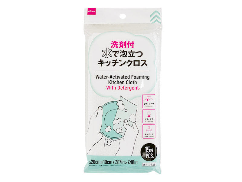洗剤がついているので、水をつけると泡立てて洗えます。●イラストはイメージです。アウトドアで オフィスで キッチンで 約20cm19cm 品名:食器用合成洗剤 成分:界面活性剤(4% アルキルエーテル硫酸エステルナトリウム) 液性:中性 用途:食器、調理器具 正味量:28g(15枚入)使用量の目安:シート1枚あたりコップ5個 長時間他の製品と表面を密着させないでください。水質によっては泡立ちにくい場合があります、その場合は洗剤を足してください。洗った物を流水ですすぐ際は、5秒以上すすいでください。ため水ですすぐ場合は、ため水を替えて2回以上すすいでください。使用後は水で手をよく洗ってください。万一洗剤液を飲み込んだ場合は吐かずに口をすすいで水を飲んでください。また、目に入った場合はこすらず直ちに流水で洗い流し、異常が残る場合は医師に相談してください。●食べ物ではありません。絶対に口に入れないでください。●本品は水に溶けません。トイレに流さないでください。●人体や食品に使用しないでください。●皮膚の弱い方は、炊事用手袋を着用してください。●キズのつきやすいものに使用しないでください。●目立たない部分で試してから使用してください。●火や熱源のそばに置かないでください。●お子様の手の届かない場所で使用・保管してください。●本来の用途以外に使用しないでください。
