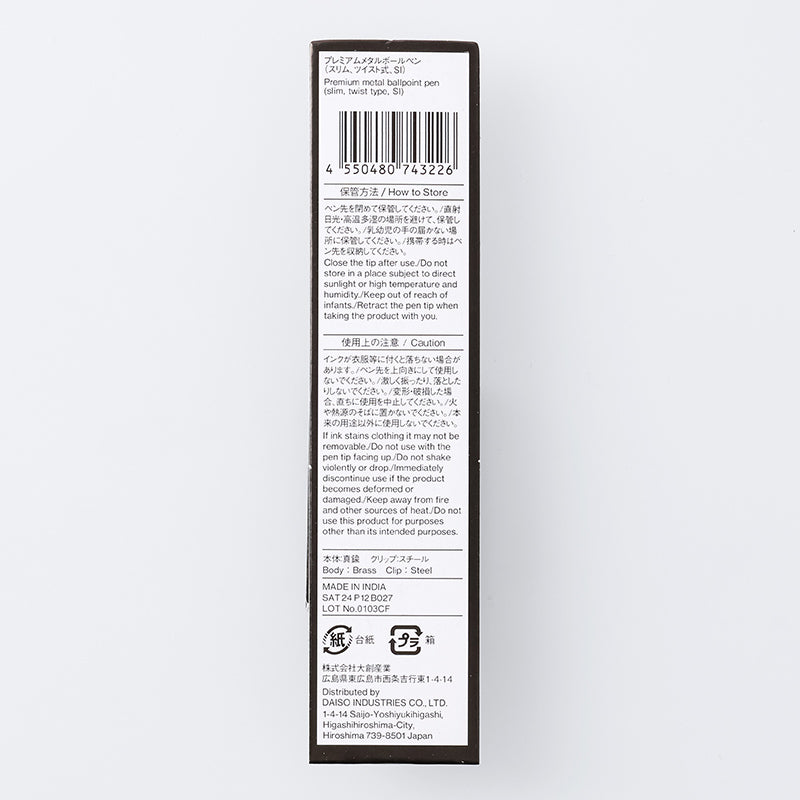 ビジネスシーンに合うツイスト式メタルボールペン スリムボディ筆記油性インク インク色:黒 ボール径:0.7mm●ペン先を閉めて保管してください。●直射日光・高温多湿の場所を避けて、保管してください。●乳幼児の手の届かない場所に保管してください。●携帯する時はペン先を収納してください。●インクが衣服等に付くと落ちない場合があります。●ペン先を上向きにして使用しないでください。●激しく振ったり、落としたりしないでください。●変形・破損した場合、直ちに使用を中止してください。●火や熱源のそばに置かないでください。●本来の用途以外に使用しないでください。