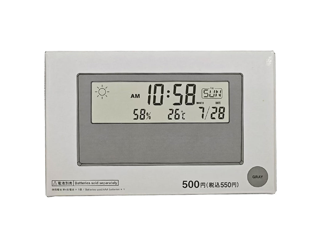 温湿度計付デジタルクロック 各部名称 表面 液晶パネル 裏面 電池フタ ①MODEボタン・表示パターン切替 ②SETボタン・長押し:各パターン表示情報の設定 ③UPボタン・短押し:最高・最低温度湿度表示切替/時刻・日付設定時「進む」・長押し:過去24時間の最高・最低温度湿度情報削除 ④DOWNボタン・短押し:時刻・日付設定時「戻る」 製品仕様 ①時間精度:±2秒/24時間 ②温度精度:±2℃ ③温度表示範囲:-10-50℃ ④湿度精度:±5%(45ー75%の場合)、±8%(45-75%以外の場合) ⑤湿度表示範囲:10ー99% ⑥使用電池:単4形乾電池(別売)×1本(1.5V) ⑦スヌーズ間隔:5分 ⑧情報更新間隔:30秒毎 液晶画面の切替と表示 ●MODEボタンを短押しするたびに、「現在時刻」→「アラーム時刻」→「カレンダー表示」の順で表示が変わります。 ●設定画面内で10秒操作しない場合、直前まで表示していた画面へ自動的に戻ります。 ●「アラーム時刻」、「カレンダー表示」は約10秒間表示された後、自動的に現在時刻に戻ります。 現在時刻 アラーム時刻 カレンダー表示①天気情報 本品周辺環境の温度/湿度を基に現在の天気がアイコン表示されます。 温度・湿度情報が表示範囲外を検知した場合、天気アイコンが表示されない場合があります。 ※設置場所の周辺環境を基に天気を表示しているため、実際の天気や温度・湿度数値と異なることがあります。ひとつの目安として使用してください。 ②時刻表示・アラーム時刻・年表示 12時間制表示の場合、AM/PM表示が時刻の横に表示されます。 ③カレンダー表示 ④温度表示 表示範囲:-10ー50℃ ⑤アラームON/OFF表示 ⑥曜日表示 ⑦湿度表示 表示範囲:10ー99% ⑧スヌーズ表示 ⑨時報表示 使用方法 ①電池ボックスに乾電池(別売り)を入れます。 ②新しい乾電池を+-を間違えないように、-から入れてください。 ③「ピッ」音が鳴り、すべての表示が点灯します。 時間・分を設定する ●MODEボタンを押し、現在時刻表示中、SETボタンを長押しすると設定モードになります。 ※12Hr(12時間制)表示設定時、AM/PMが時刻の横に表示されます。 「12/24Hr(12/24時間制)」をUP/DOWNボタンで選択 「時刻」をUP/DOWNボタンで合わせる 「分」をUP/DOWNボタンで合わせる 押して設定完了 西暦・月・日を設定する ●カレンダー表示中、SETボタンを長押しすると設定モードになります。「時間・分を設定する」の操作と同じように「西暦」「月」「日」を合わせてください。 ※曜日は日付に合わせて自動で表示されます。 アラームの時刻を設定する ●MODEボタンを押し、アラーム時刻表示中、SETボタンを長押しすると設定モードになります。「時間・分を設定する」の操作と同じように「時間」「分」を合わせてください。アラームをONにする ①アラーム時刻表示中、UPボタンを短押しするたびに、「アラームON」→「時報ON」→「アラームON・時報ON」→「OFF」の順でアラーム設定が変わります。 ②アラーム設定した時間になると、アラーム音が鳴ります。 ③アラーム音が鳴っている時にいずれかのボタンを長押しすると、アラーム音が止まります。 ※アラーム音は約1分間鳴った後、自動的に止まります。 ●ただし、アラーム設定は解除されません。(翌日アラームセット時間にアラームが作動します。) 時報:00分になると一度だけ電子音が鳴ります。 スヌーズを設定する アラーム音停止後(約5分後)に、再びアラーム音が鳴る機能です。 ②アラーム音が鳴っている時にいずれかのボタンを押すと、スヌーズが設定され、スヌーズマークが点滅します。 ③以降、約5分ごとにアラーム音が鳴ります。 ④スヌーズモードの状態でいずれかのボタンを長押しすると、スヌーズ設定を解除します。 ⑤スヌーズ表示マークが消えます。温度・湿度表示 「温度・湿度の最高最低値表示」 ●現在時刻表示中にUPボタンを短押しすると、温度・湿度表示が「最高」→「最低」の順で表示が切り替わります。 ※直近24時間以内の測定結果を表示します。 最高温度・湿度 最低温度・湿度 最高最低値のリセット ●現在時刻表示中にUPボタンを2秒以上長押しすると最高/最低温度・湿度情報が削除されます。 測定範囲外の表示 ●表示範囲外の温度・湿度を検知した場合「--%、--℃」と表示されます。 天気判定の温度・湿度条件 ●温度:0℃未満のとき 湿度40%以下…………快晴 湿度41ー60%…………晴れ 湿度61ー75%…………くもり 湿度76%以上…………雪 ●温度:0ー14℃のとき 湿度40%以下…………快晴 湿度41ー65%…………晴れ 湿度66ー71%…………くもり 湿度72%以上…………雨 ●温度:15ー24℃のとき 湿度55%以下…………快晴 湿度56ー70%…………晴れ 湿度71ー79%…………くもり 湿度80%以上…………雨 ●温度:25℃以上 湿度60%以下…………快晴 湿度61ー75%…………晴れ 湿度76ー86%…………くもり 湿度87%以上…………雨 ●本品は防水仕様ではありません。 時間の経過で誤差が発生する場合があります。●長期間使用しない場合は電池を外してください。●分解や改造をしないでください。●落としたり、ぶつ
