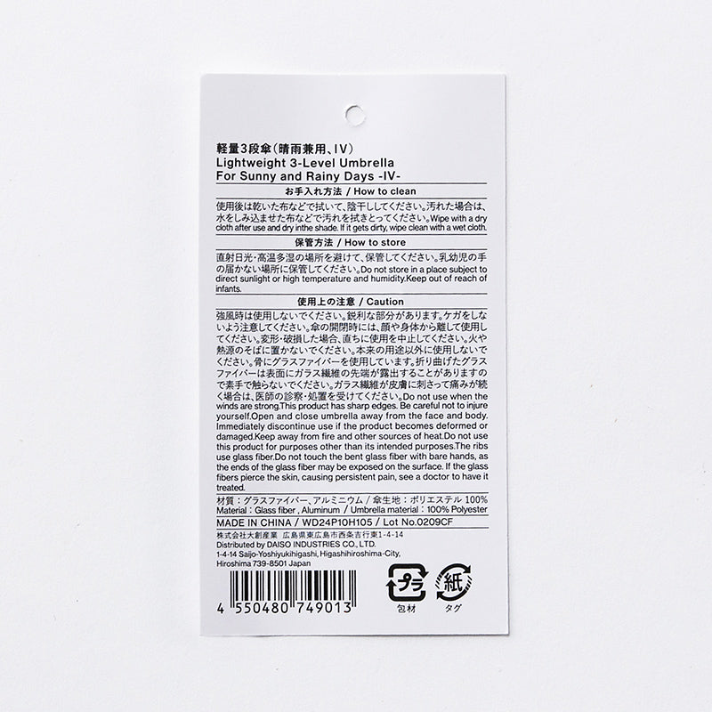 3段式タイプ 紫外線遮蔽率90%。親骨の長さ:50cm×5本●使用後は乾いた布などで拭いて、陰干ししてください。●汚れた場合は、水をしみ込ませた布などで汚れを拭きとってください。●直射日光・高温多湿の場所を避けて、保管してください。●乳幼児の手の届かない場所に保管してください。●強風時は使用しないでください。●鋭利な部分があります。ケガをしないよう注意してください。●傘の開閉時には、顔や身体から離して使用してください。●変形・破損した場合、直ちに使用を中止してください。●火や熱源のそばに置かないでください。●本来の用途以外に使用しないでください。●骨にグラスファイバーを使用しています。●折り曲げたグラスファイバーは表面にガラス繊維の先端が露出することがありますので素手で触らないでください。ガラス繊維が皮膚に刺さって痛みが続く場合は、医師の診察・処置を受けてください。