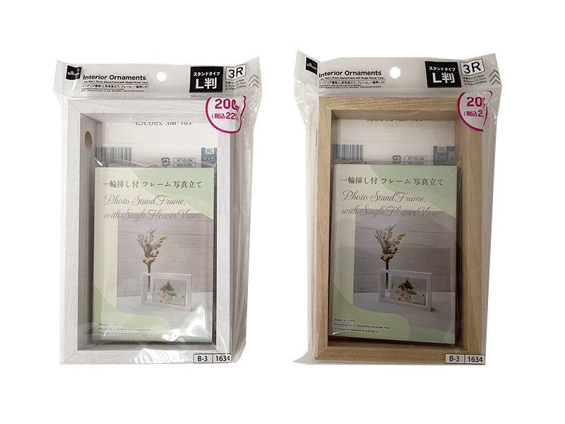 対応サイズ スタンドタイプ L判 写真サイズ 8.9cm×12.7cm(セット内容) フレーム:1台 透明板(表面):1枚 板(裏面):1枚 一輪挿し:1本①2枚の板で絵や写真を挟み、フレームの溝に固定します。 ②一輪挿しをフレームの穴に固定し、花等を挿して完成です。 (一輪挿しが倒れないことを確認してください)●写真光沢紙は使用しないでください。●平らな場所で使用してください。●お子様の手の届かない場所で使用・保管してください。●直射日光・高温多湿の場所を避けて、使用・保管してください。●変形・破損した場合、直ちに使用を中止してください。●火や熱源のそばに置かないでください。●白・淡色の壁に長期間接触させないでください。●長期間他の製品と密着させないでください。可塑剤の影響で変質、色移りの恐れがあります。