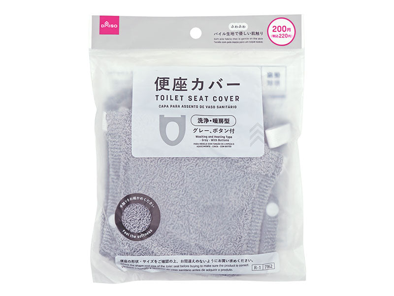 ふわふわパイル生地で優しい肌触り 手触りをお確かめください 便座サイズの目安縦:約40cm〜44cm 横:約33cm〜37cm1.便座を倒した状態で、カバーを便座にかぶせます。2.便座を立て、便座のクッション部分にカバーが挟まらないようにボタンを留めます。3.便座クッションに引っかかるようにゴム紐とフックを留めてください。クッション部分●他の製品と一緒に洗濯しないでください。●洗濯ネットに入れて洗濯してください。●塩素系洗剤・漂白剤は、使用しないでください。●タンブラー乾燥はしないでください。●陰干ししてください。●便座の形状・サイズをご確認の上、お間違えのないようにお買い求めください。●パイルがほどけた場合は、ハサミでカットしてください。●サイズや形状が合わない場合は使用しないでください。使用中に外れる恐れがあります。●薬品を使って掃除をする際は、本品を外してください。●伸縮する素材を使用しているため、サイズに違いが生じる場合があります。●強くねじったり、引っ張ったりしないでください。●暖房便座で使用する際は、必ず暖房の電源を切って使用してください。●変形・破損時は使用中止●火や熱源のそばに置かない●用途外に使用しない
