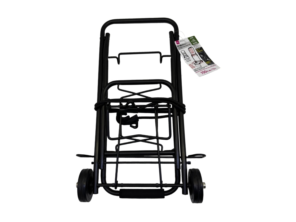 ・※使用の際はゴムひもで荷物を固定し、使用してください。 ・折りたためてコンパクト ・耐荷重:約20kg ・耐荷重は測定値であり、保証値ではありません。 ・使用の際は、必ずフックで固定して使用してください。 ・荷物台を広げて使用すると、より多くの荷物が載せられます。 ・寸法(約):幅300mm × 奥行き260mm × 高さ840mm●イラストはイメージです。①荷物台を下げます。 ②ハンドルを上に起こします。 ③フックを下げて固定します。 ※使用の際は、必ずフックで固定して使用してください。●使用する前に、本品がしっかり組み立てられていることを確認の上、使用してください。 ●使用の際は、その都度製品に異常がないことを確認した上で使用してください。 ●20キログラム(耐荷重)以上の重さの荷物を載せないでください。 ●耐荷重はあくまでも目安です。使用状況により異なります。 ●本品より大きい物を置いたり、不安定な位置に置くと転倒・落下する恐れがあります。 ●可動部に指などを挟まないよう注意してください。 ●本品の上に立ったり、踏み台として使用しないでください。●サイズが合わない場合は使用しないでください。●貴重品や壊れやすいものに使用しないでください。●強く引っ張ったり、振り回したりしないでください。●指や首に巻き付けないでください。●濡れたまま放置しないでください。●直射日光・高温多湿の場所を避けて、使用・保管してください。●乳幼児の手の届かない場所で使用・保管してください。●変形・破損した場合、直ちに使用を中止してください。●火や熱源のそばに置かないでください。●本来の用途以外に使用しないでください。
