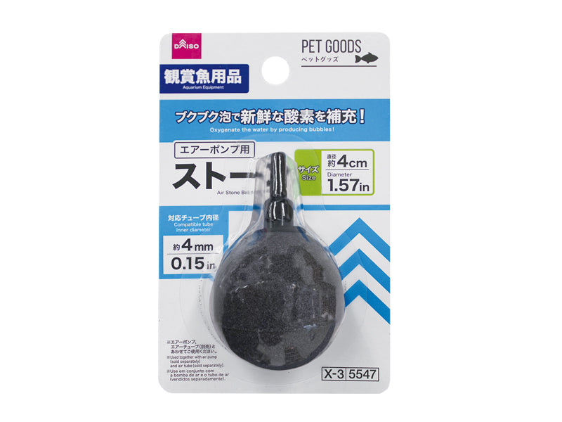 観賞魚用品、ブクブク泡で新鮮な酸素を補充!エアーポンプ、エアーチューブ(別売)とあわせてご使用ください。エアーポンプに使用するエアストーンです。直径 約4cm、対応チューブ内径:約4mm1.ご使用の前に水洗いします。2.ストーンの突起部分をエアーチューブの先にしっかりと接続します。3.エアーポンプのスイッチをいれます。汚れた場合は水洗いしてください。薬品は使用しないでください。●お子様の手の届かない場所に保管してください。●直射日光・高温多湿の場所を避けて、保管してください。●水中に手を入れる際は、すべての水槽器具の電源を切ってから作業してください。●目詰まりし泡が出づらくなった際は、買い替えをご検討ください。●食べ物ではありません。絶対に口に入れないでください。●火や熱源のそばに置かないでください。●本来の用途以外に使用しないでください。●強く引っ張らないでください。●変形・破損した場合、直ちに使用を中止してください。