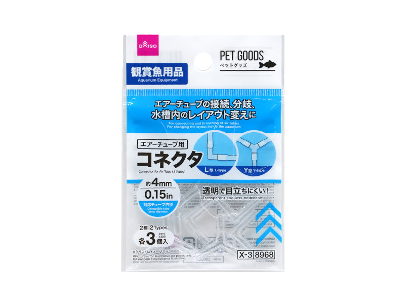 観賞魚用品 エアーチューブの接続、分岐、 水槽内のレイアウト変えに 透明で目立ちにくい●写真はイメージです。エアーチューブを接続するツールです。対応チューブ 内径約4mm 2種 各3個入●コネクタの先端にチューブをしっかりと装着します。汚れた場合は水洗いしてください。薬品は使用しないでください。●お子様の手の届かない場所に保管してください。●直射日光・高温多湿の場所を避けて、保管してください。水中に手を入れる際は、すべての水槽器具の電源を切ってから作業してください。●落とす、ぶつける等の強い衝撃を与えないでください。●食べ物ではありません。絶対に口に入れないでください。●火や熱源のそばに置かないでください。●本来の用途以外に使用しないでください。●変形・破損した場合、直ちに使用を中止してください。