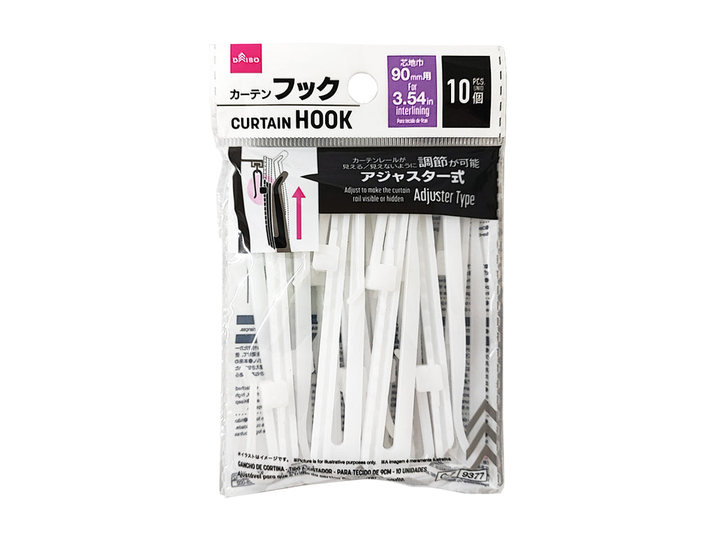 カーテンレールが見える/見えないように調節が可能 半間用 芯地巾90mm用 取付方法 フックの位置を決めてカーテンに取り付けます。 フックを下方向へ押し下げて高さの調整をしてください。 押し下げ過ぎた場合は、下方向へ抜いて改めて上から差し込んでください。●乳幼児の手の届かない場所に保管してください。やわらかいカーテン素材に使用する時は生地を傷つける恐れがあります。取り扱いには十分注意してください。 取り付けたカーテンを強く引っ張らないでください。●サイズが合わない場合は使用しないでください。●直射日光・高温多湿の場所を避けて、使用・保管してください。●変形・破損した場合、直ちに使用を中止してください。●火や熱源のそばに置かないでください。●本来の用途以外に使用しないでください。●生産に万全を期しておりますが、万一不良の場合にはお買い上げ店にてお取り替えさせていただきます。本品使用目的以外の使用に起因するなど、本品の欠陥に基づかない損害については当社では責任を負いかねます。あらかじめご了承の上お買い求めください。