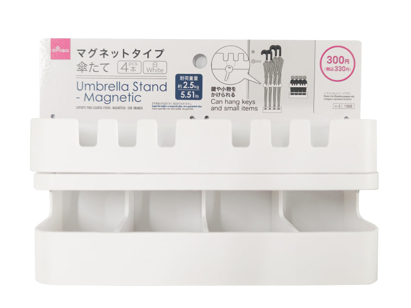 耐荷重量は測定値であり、保証値ではありません。 鍵や小物をかけられる 四つのフック付 多機能 ●イラストはイメージです。収納本数:4本 耐荷重量:約2.5kg 折りたたみタイプの傘も収納できます。 マグネット式で簡単に取り外しができるので、傘の長さに合わせて位置を調整可能!平らな鉄製の場所に取付けて使用してください。 上のホルダーを図のように取り付けます。 傘の長さに合わせて下のホルダーの位置を決め、取り付けます。 上下ホルダーの位置を垂直に取り付けてください。木製ドアには取り付けできません。●磁気に影響を受けるものに近づけないでください。●変形・破損した場合、直ちに使用を中止してください。●本来の用途以外に使用しないでください。●マグネットは接着面を引きずらないでください。