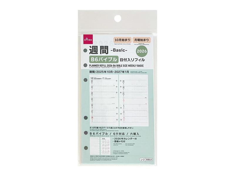 10月始まり 月曜始まり 期間/2025年10月-2027年1月 たっぷり書けるスペースで週ごとの予定を管理しやすい 6穴対応 六曜入 2026年カレンダー付 罫線メモ付●イラストはイメージです。