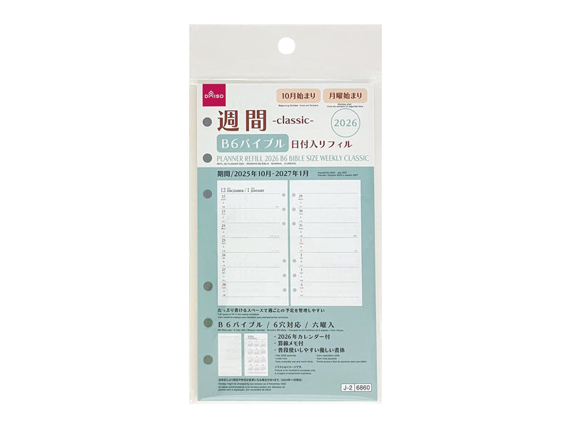 10月始まり 月曜始まり 期間/2025年10月-2027年1月 たっぷり書けるスペースで週ごとの予定を管理しやすい 6穴対応 六曜入 2026年カレンダー付 罫線メモ付 普段使いしやすい優しい書体●イラストはイメージです。