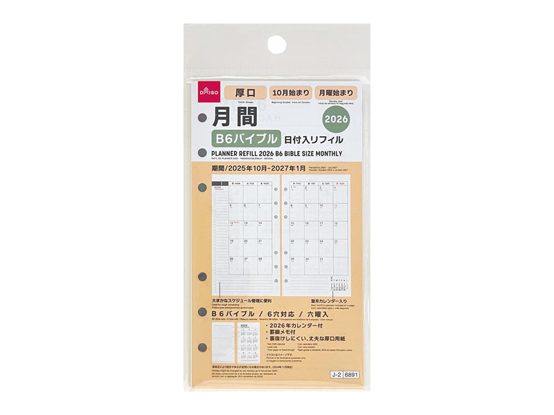 10月始まり 月曜始まり 期間/2025年10月-2027年1月 大まかなスケジュール管理に便利 翌月カレンダー入り 6穴対応 六曜入 2026年カレンダー付 罫線メモ付 裏抜けしにくい、丈夫な厚口用紙 厚口●イラストはイメージです。