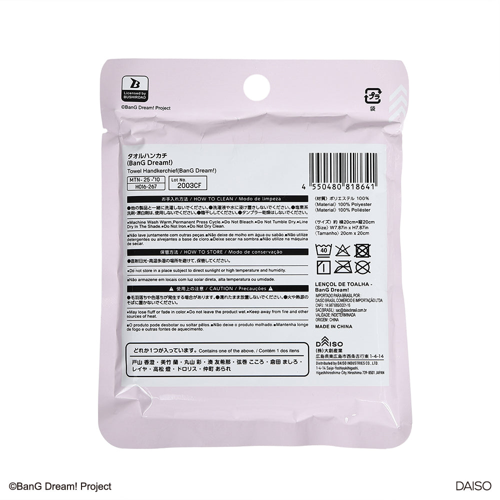BanG Dream! Project 全10種 どれか1つが入っています。約横20cm×縦20cm●他の製品と一緒に洗濯しないでください。 ●洗濯液や水に浸け置きしないでください。 ●塩素系洗剤・漂白剤は、使用しないでください。 ●陰干ししてください。 ●タンブラー乾燥はしないでください。●直射日光・高温多湿の場所を避けて、保管してください。●毛羽落ちや色落ちが発生する場合があります。●濡れたまま放置しないでください。●火や熱源のそばに置かないでください。