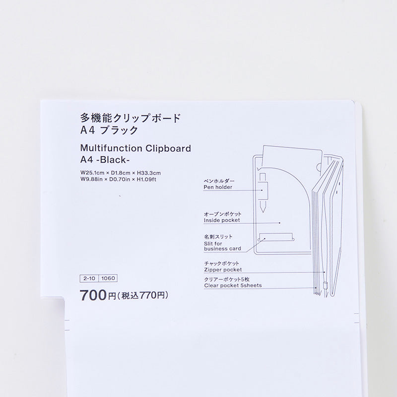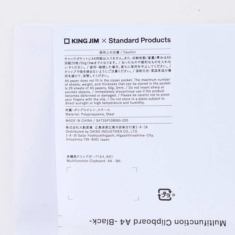 多機能クリップボード A4 ブラックなし●直射日光・高温多湿の場所を避けて、保管してください。チャックポケットにA4用紙は入りません。また、収納枚数・重量・厚みはA5用紙20枚、50g、3㎜までとなります。 クリップで指を挟まないようにご注意ください。●尖ったものや鋭利なものを入れないでください。●変形・破損した場合、直ちに使用を中止してください。
