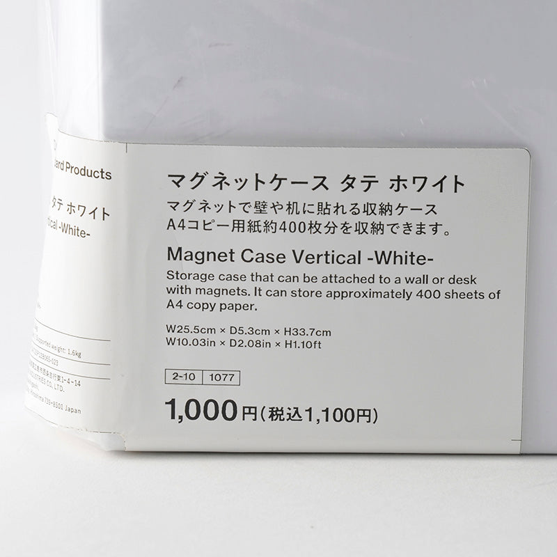 マグネットケース タテ ホワイト マグネットで壁や机に貼れる収納ケース A4コピー用紙約400枚分を収納できます。耐荷重:1.6kg汚れは柔らかい布で乾拭きしてください。●直射日光・高温多湿の場所を避けて、保管してください。本品は、取付対象に完全に固定できるものではありません。 本品の耐荷重は1.6kgですが、取付対象の形状や状態、金属の材質や厚み、表面の汚れなどによって1.6kgに満たない場合もあります。 マグネット部をパソコンなどの電子機器・時計・磁気カードなどの磁気の影響を受ける恐れのあるものに近づけないでください。 マグネットは接着面を引きずらないでください。