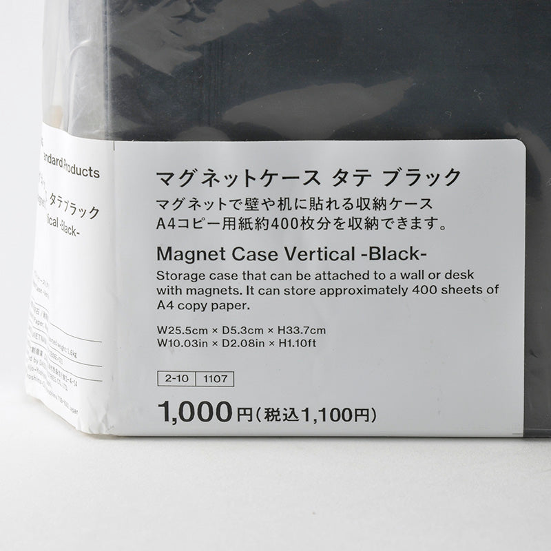 マグネットケース タテ ブラック マグネットで壁や机に貼れる収納ケース A4コピー用紙約400枚分を収納できます。耐荷重:1.6kg汚れは柔らかい布で乾拭きしてください。●直射日光・高温多湿の場所を避けて、保管してください。本品は、取付対象に完全に固定できるものではありません。 本品の耐荷重は1.6kgですが、取付対象の形状や状態、金属の材質や厚み、表面の汚れなどによって1.6kgに満たない場合もあります。 マグネット部をパソコンなどの電子機器・時計・磁気カードなどの磁気の影響を受ける恐れのあるものに近づけないでください。 マグネットは接着面を引きずらないでください。