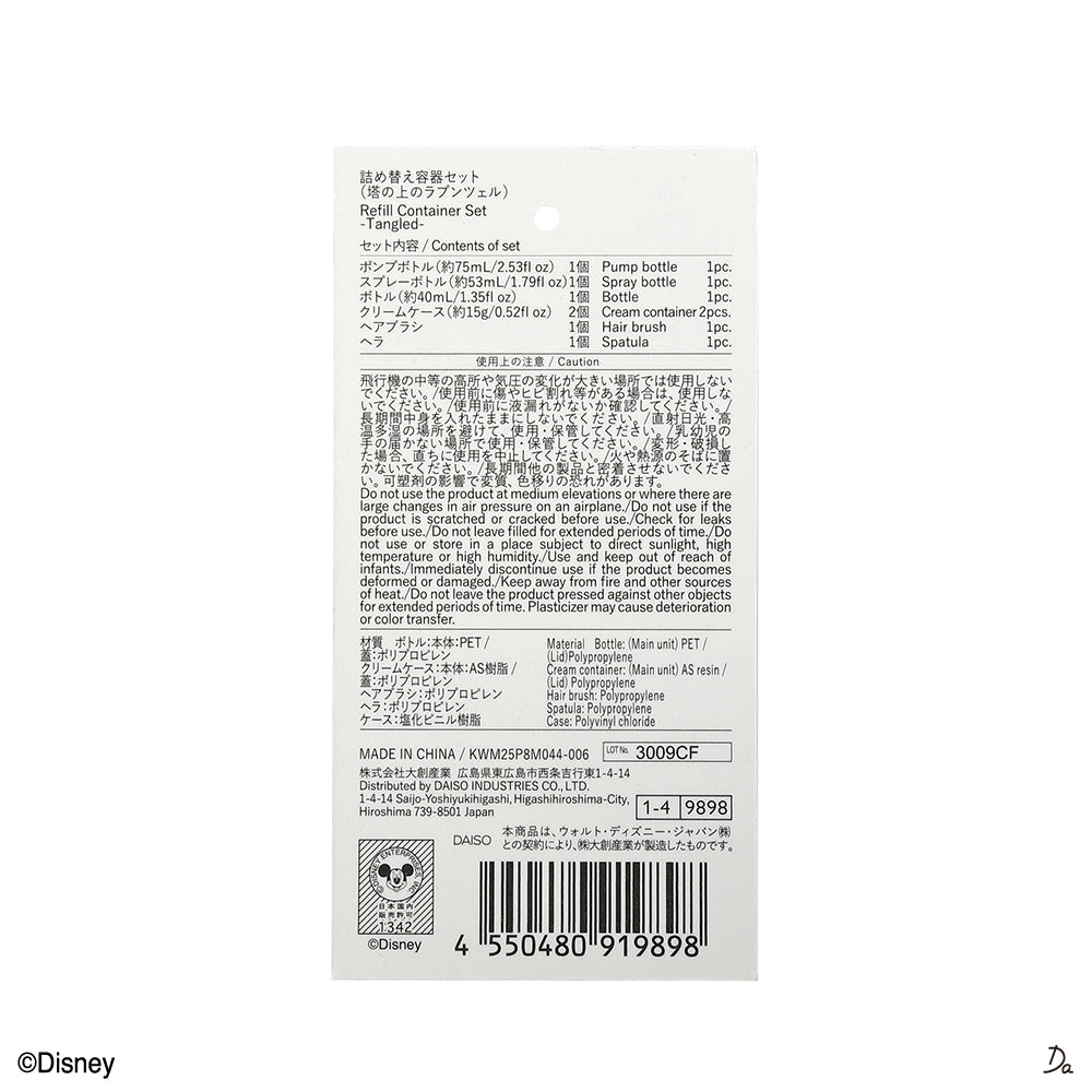 セット内容ポンプボトル 約75mL 1個スプレーボトル 約53mL 1個ボトル 約40mL 1個クリームケース 約15g 2個入りヘアブラシ 1個ヘラ 1個●飛行機の中等の高所や気圧の変化が大きい場所では使用しないでください。●使用前に傷やヒビ割れ等がある場合は、使用しないでください。●使用前に液漏れがないか確認してください。●長期間中身を入れたままにしないでください。●直射日光・高温多湿の場所を避けて、使用・保管してください。●乳幼児の手の届かない場所で使用・保管してください。●変形・破損した場合、直ちに使用を中止してください。●火や熱源のそばに置かないでください。●長期間他の製品と密着させないでください。可塑剤の影響で変質、色移りの恐れがあります。