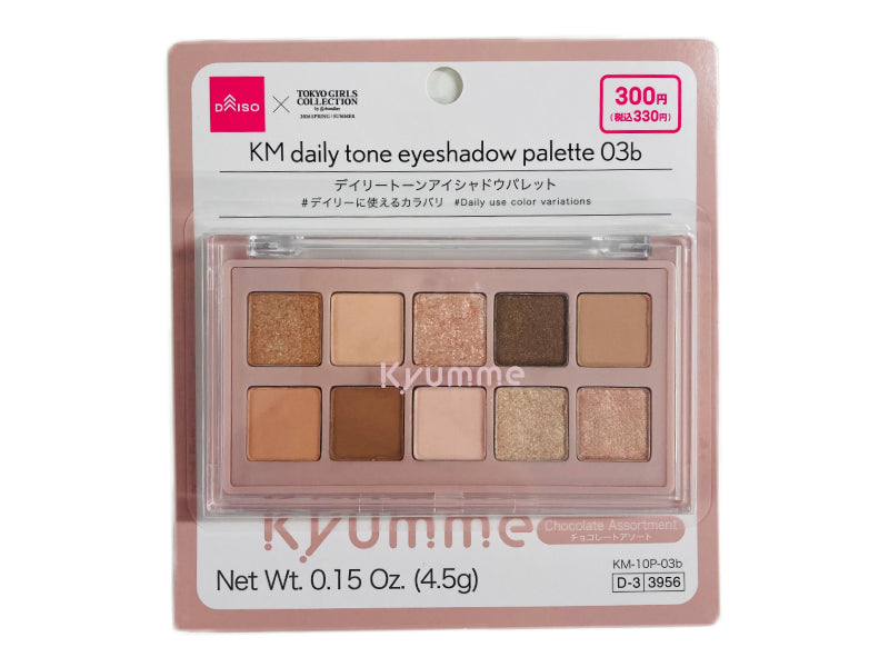 #デイリーに使えるカラバリ チョコレートアソート Net Wt. 0.15 Oz. 4.5g KM 10P 03bアイシャドウ様々な質感と使いやすくまとまったカラーバリエーションの10色パレット。日常使いにぴったりのアイシャドウです。お手持ちのブラシやチップ、または指先に適量をとり、まぶたに軽くのばします。 グリッターはチップなどで軽くとりながら、まぶたにポンポンとのせるようにご使用ください。 ※持ち運びの際には十分注意ください。 ●肌に異常が生じていないかよく注意して使う。肌に合わない時や、使用中、赤味、はれ、かゆみ、刺激、色抜け(白斑等)や黒ずみ等の異常が出た時、また、日光があたって同じような異常が出た時は、使用を中止して皮膚科医へ相談する。使い続けると症状が悪化する場合がある。●傷やはれもの、しっしん等、異常のある部位には使わない。●目に入らないよう注意。●落下等の衝撃に注意。●使用後はしっかり蓋をしめる。●乳幼児の手の届かないところに保管。●極端に高温又は低温の場所、直射日光のあたる場所には保管しない。