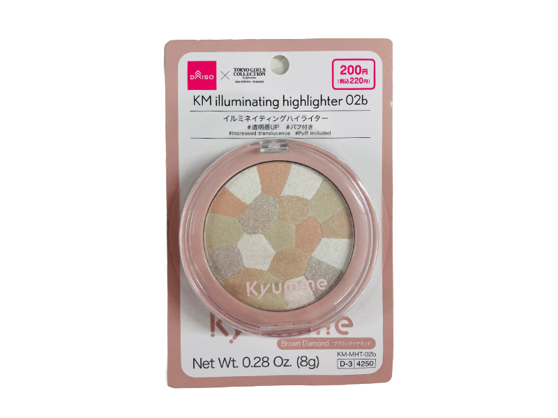 イルミネイティングハイライター #パフ付き #透明感UP ブラウンダイヤモンド Net Wt. 0.28 Oz. 8g KM MHT 02bハイライト繊細ラメがお肌に透明感を与えるハイライトパウダー。パフ付き。くすみをカバーして、顔色をトーンアップし、透明感を与えます。①付属のパフやお手持ちのブラシに適量を含ませ、手の甲でつき具合を調節します。 ②ツヤを与えたい箇所にポンポンとやさしくあてながら重ねます。 ●肌に異常が生じていないかよく注意して使う。肌に合わない時や、使用中、赤味、はれ、かゆみ、刺激、色抜け(白斑等)や黒ずみ等の異常が出た時、また、日光があたって同じような異常が出た時は、使用を中止して皮膚科医へ相談する。使い続けると症状が悪化する場合がある。●傷やはれもの、しっしん等、異常のある部位には使わない。●目に入らないよう注意。●落下等の衝撃に注意。●使用後はしっかり蓋をしめる。●乳幼児の手の届かないところに保管。●極端に高温又は低温の場所、直射日光のあたる場所には保管しない。