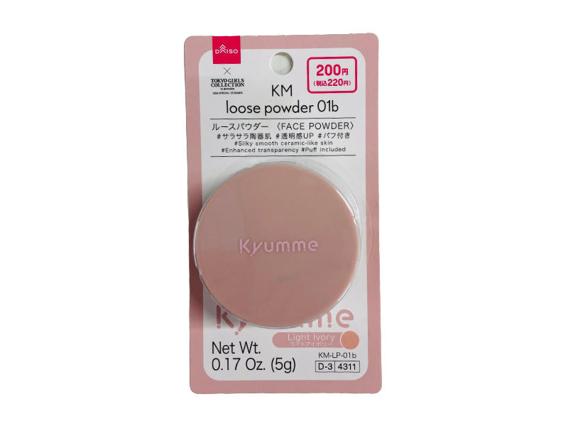 ルースパウダー #サラサラ陶器肌 #透明感UP #パフ付き ライトアイボリー Net Wt. 0.17 Oz. 5g KM LP 01bフェイスパウダーきめ細かな超さらさらフェイスパウダー。パフ付き。 お肌をなめらかに整え、さらさら陶器肌を長時間キープ。①容器の蓋を開けて中蓋の透明シートを剥がします。 ②付属のパフまたはお手持ちのブラシにパウダーを適量とり、手の甲でつき具合をみてから顔全体に塗布します。 ※粉がこぼれることがありますので、携帯はしないでください。 ●肌に異常が生じていないかよく注意して使う。肌に合わない時や、使用中、赤味、はれ、かゆみ、刺激、色抜け(白斑等)や黒ずみ等の異常が出た時、また、日光があたって同じような異常が出た時は、使用を中止して皮膚科医へ相談する。使い続けると症状が悪化する場合がある。●傷やはれもの、しっしん等、異常のある部位には使わない。●目に入らないよう注意。●落下等の衝撃に注意。●使用後はしっかり蓋をしめる。●乳幼児の手の届かないところに保管。●極端に高温又は低温の場所、直射日光のあたる場所には保管しない。