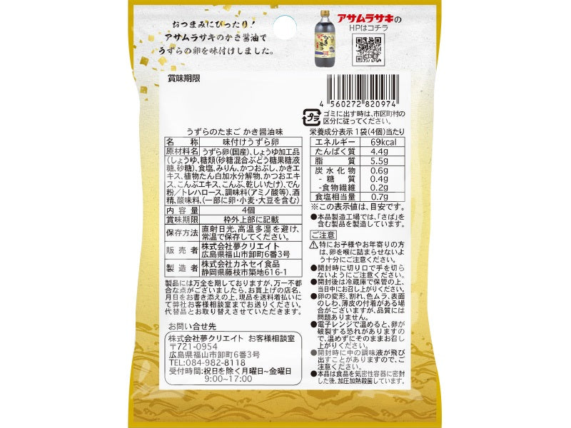 特徴:うずら卵水煮の専門企業とアサムラサキとコラボ商品。原料に「かき醤油」を使用し、牡蠣のうま味が効いて老若男女に好まれる味です。お酒のおつまみ、お茶請けに最適な味です。