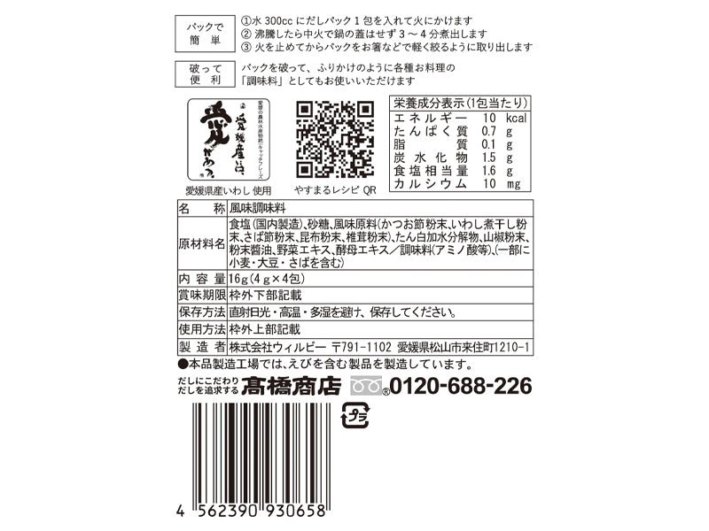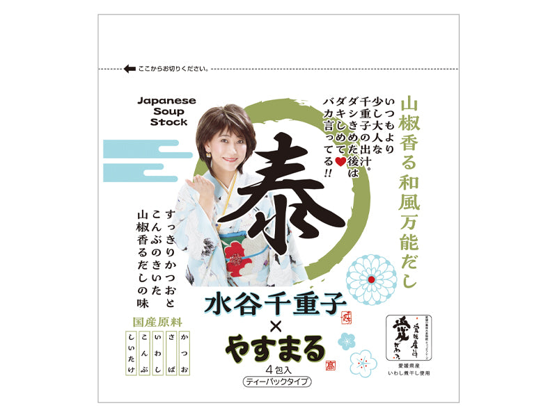 特徴:ティーパックタイプのだしパック。パックを煮出して使う通常の方法とあわせて、パックを破って中身を粉末調味料としても使える。パックの中身に塩、砂糖、粉末醤油も含まれているため、他の調味料を一切使わなくてもやすまるだしだけでしっかり味がきまる。塩コショウのかわりに、醤油のかわりにふりかけて使える、万能調味料。