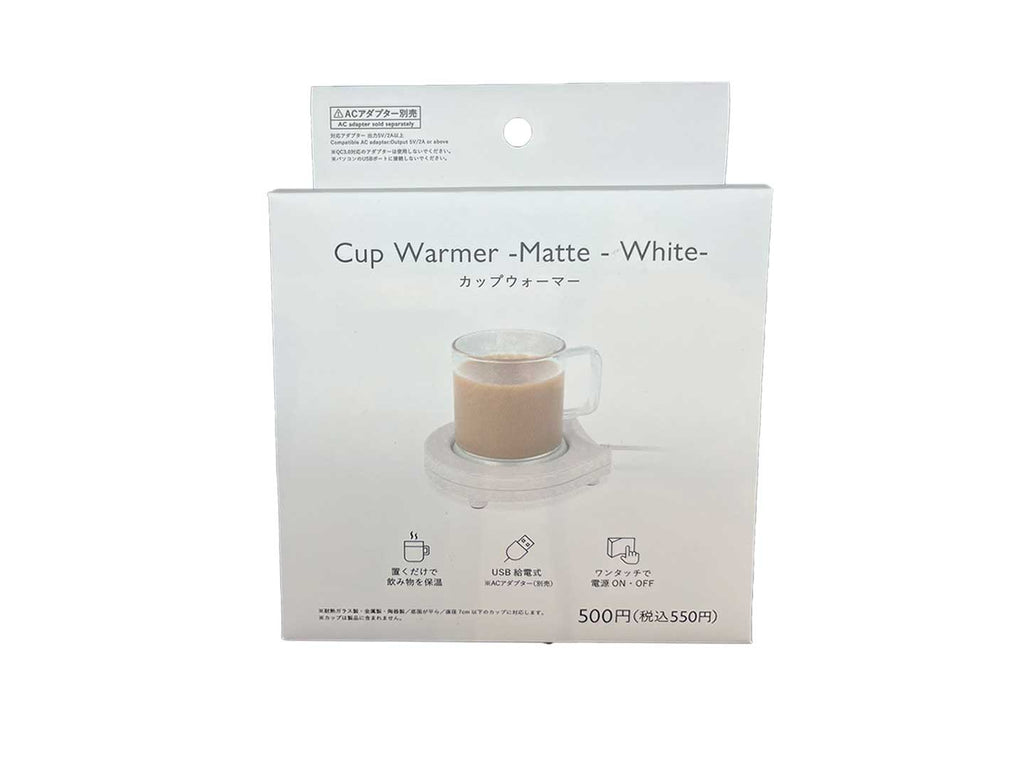 カップウォーマー置くだけで飲み物を保温USB給電式※ACアダプター(別売)ワンタッチで電源ON・OFF※耐熱ガラス製・金属製・陶器製/底面が平ら/直径7cm以下のカップに対応します。※カップは製品に含まれません。カップを置くだけで保温いつでも温かい飲み物を楽しめますACアダプターが必要です。別途お買い求めください。対応アダプター 出力5V/2A以上※QC3.0対応のアダプターは使用しないでください。※パソコンのUSBポートに接続しないでください。カップウォーマーこの度は本品をご購入いただきありがとうございます。使用前に本取扱説明書を最後までお読みいただき、正しくお使いください。読み終わった後は、大切に保管してください。内容物□カップウォーマー本体……………1台□取扱説明書……………………1部各部名称ヒーター部分ケーブル電源ボタンコネクター(Type-A)●イラストはイメージです。特徴置くだけで温かい飲み物を保温するコースター型カップウォーマー電源ボタンを押すだけ簡単操作USB給電式(Type-A)対応カップ※耐熱ガラス製・金属製・陶器製/底面が平ら/直径7cm以下のカップに対応します。※厚手、高台があるもの、底面が平らでないカップは保温できません。※底面・側面の厚み・形状・材質など、カップの構造によっては本品を使用できない場合があります。対応カップ●耐熱ガラス製/金属製/陶器製●底面が平らなもの●直径7cm以下のもの※上記以外の素材(紙製/木製/ペットボトルなど)や底面が平らでないカップ、厚手や高台があるカップはご使用できません。※底面・側面の厚み・形状・材質など、カップの構造によっては本品を使用できない場合があります。※耐熱素材以外のカップ・ペットボトルや紙コップなどは使用しないでください。※本品は温かい飲み物を保温します。すでに冷めている飲み物を加熱する機能はついていません。※デザインおよび仕様について、改良のため予告なしに変更することがあります。※パッケージに記載の会社名および商品名は、各社の商標または登録商標です。※商品の仕様および外観などは商品改良のため予告なく変更することがあります。※本書に記載の社名および製品名は各社の商標または登録商標になります。※写真・イラストはイメージです。商品仕様材質:ABS樹脂/TPE/スチール本体サイズ:W11.6cm×D11.4cm×H2.8cmケーブル長:104cm給電方法:Type-A給電定格電圧/電流:5V/2A推奨アダプタ:5V/2A以上のACアダプタ(別売)消費電力:10W内容物:カップウォーマー本体/取扱説明書※数値は使用環境により変動します。MADE IN CHINA【お問い合わせ先】MAKER株式会社TEL:050-3733-6050(平日10時ー17時)TEL 050-3733-6050(受付時間:平日10時ー17時)Mail:support@malercorp.jp※電話がつながらない場合や、平日10時ー17時以外のご連絡に関しましては恐れいりますがメールにてご連絡ください。温度比較(本品使用時と未使用時の比較)※室温25℃で、ステンレスカップにお湯250mLを入れた場合の1時間後の参考温度です。※飲み物の内容量やカップの形状・材質・室温によって変動します。本品使用時未使用時開始温度80℃1時間後温度53℃39℃1/ACアダプター(別売)に接続し、電源をONにします。2/対応したカップを本品ヒーター部分に置きます。3/使用後は必ず電源をOFFにし、ケーブルを外してください。使用方法※ヒーター部分は使用中、高温になるため絶対に触れないでください。※トラベル用コンバータなど変圧器を使って給電すると、発熱・発火の恐れがあります。1/本体ケーブルをACアダプター(出力5V/2A以上、別売)と接続します。※QC3.0対応など5Vより高い電圧(V)がかかるACアダプターは使用しないでください。※パソコンのUSBポートでは給電できません。注意してください。出力5V/2A以上のACアダプター(別売)2/電源ボタンをONにするとヒーターの加熱がはじまります。ヒーター部分にカップをセットしてください。※耐熱ガラス製・金属製・陶器製/底面が平ら/直径7センチ以下のカップに対応します。※飲み物がぬるく感じる際は、フタを併用することでより効果的にご使用いただけます。(マグカップ専用のフタをご使用ください。)3/使用しないときは電源ボタンをOFFにし、本体ケーブルをACアダプターから取り外してください。※本品には自動OFF機能はありません。電源の消し忘れには十分注意してください。お手入れ方法●必ず本体ケーブルをACアダプターから外し、本体が冷えたことを確認してからお手入れしてください。●乾いた布で汚れを拭き取ってください。※本品は防水仕様ではありません。絶対に水洗いしないでください。使用上の注意使用前に同梱の取扱説明書をよく読み、正しく使用してください。本品は温かい飲み物を保温します。すでに冷めている飲み物を加熱する機能はついていません。ご了承ください。ヒーター部分の表面温度は最大約100Cまであがります。加熱中のヒーター部分には直接触れないよう十分注意してください。使用中、本品が発する熱が伝わりテーブルが高温