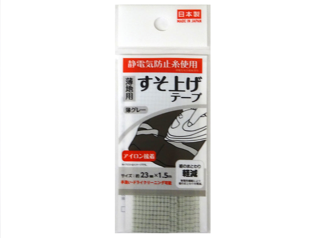 裾のまとわり軽減(制電性繊維により裾のまとわりを軽減)手洗い・ドライクリーニング可能●イラストはイメージです。静電気防止糸使用(導電性複合繊維使用)薄地用アイロン接着サイズ:約23mm×1.5m①テープを必要な長さより2-3㎝余分にカットします。②テープの接着面(白い粒の面)をズボンに当ててください。接着は内股の中心から始め、テープは引っ張らずに、強く押し当てます。③アイロンは中温(140℃-160℃)でスチームまたは霧吹きを使用します。1回に15cmくらいずつ約3秒間、アイロンは滑らさず、当て布の上から体重をかけるように強く押し当てます。接着面が段になるので、低い部分には特に強く押さえて接着してください。※アイロンはスチーム穴は避けてご使用ください。●防水・撥水加工された生地や、アイロンが中温でかけられない生地には使用しないでください。●特殊加工、毛足の長い素材、凹凸のある素材、油等の汚れ素材には接着できません。●テープの表裏を確かめてからご使用ください。●薄地の生地は熱接着系のシミ出しがありますので、必ずテストの上ご使用ください。●プレス後は完全に冷めるまで動かさないでください。冷める前に動かすとはがれ易くなります。●やけどにご注意ください。●幼児の手の届かないところで保管ください。●すそが細い場合は、作業前に少し縫い目をほどいた状態で形を整えてご使用ください。●制電は静電気を全て除去するものではありません。●接着後は貼り直しできません。●直射日光・高温多湿の場所を避けて、使用・保管してください。●本来の用途以外に使用しないでください。