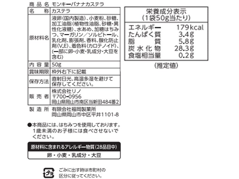 特徴:大正6年創業の老舗メーカー。バナナカステラにこだわり、いつまでも変わらない優しい、素朴な味わいです。