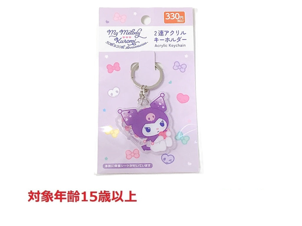 商品サイズ:クロミ:トップ横4.9×縦5.4×厚さ0.3cm 全長6.6cm、ケーキ:トップ横4×縦3.9×厚さ0.3cm 全長5.3cm、二重リング:横3×縦0.3×奥行3cm、キーホルダー全長9.1cm