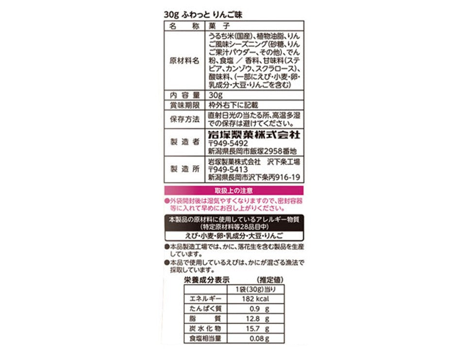 特徴:りんごの風味が広がる、サクッと軽くてとろけるような食感のお米スナック