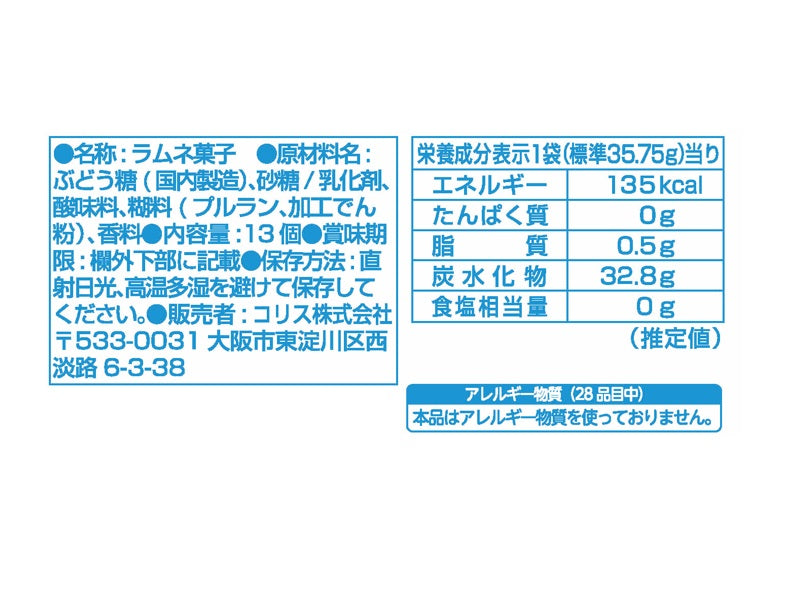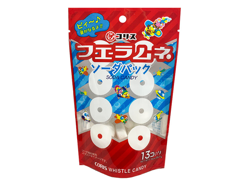 特徴:爽やかなソーダ味のフエラムネが入ったお菓子。持ち運びに便利なチャック付袋。
