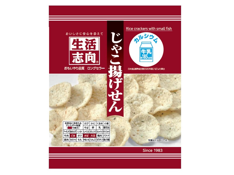 特徴:カルシウム強調アイコン 211mg(1袋32g当たり)牛乳約185ml分Rice cracker with small fishおもいやり品質 ロングセラー、Since 1983