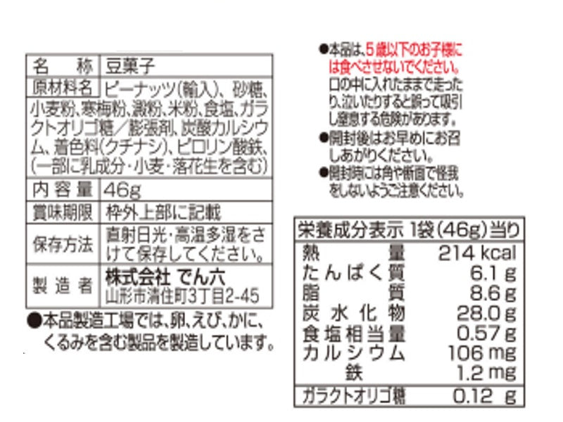 特徴:優しい甘さ。なつかしい味。一粒食べたらやめられない、でん六の看板商品。