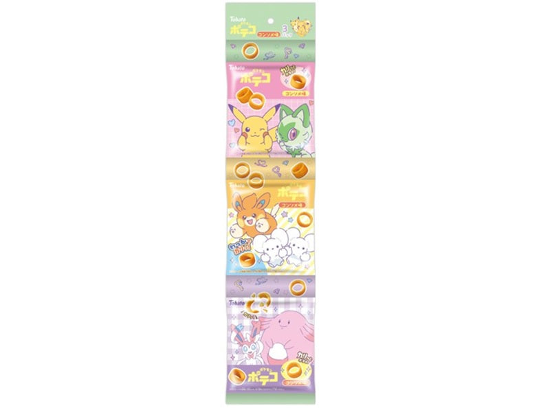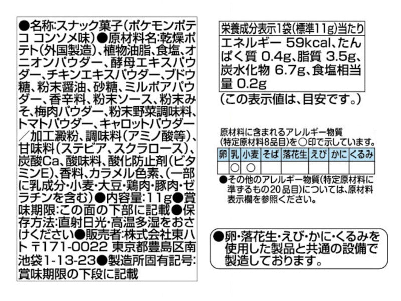 特徴:カリッとはじける食感のポテトリングスナック、ポテコのコンソメ味がポケットモンスターのデザインで新登場です。チキンの旨味に、たまねぎ・にんじん・トマトのおいしさをきかせた、コクと旨みのあるコンソメ味です。ついつい手がすすむ、食べ飽きないおいしさをぜひお楽しみください。小分けで配れるうれしい3袋の吊り下げ包装です。
