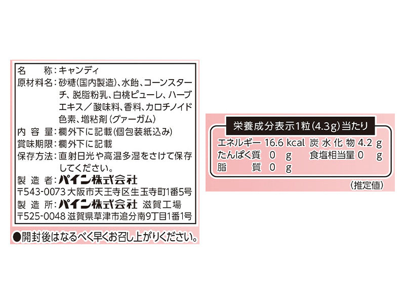 特徴:白桃の豊潤な香りがお口いっぱいに広がりるのどに優しいキャンディです。