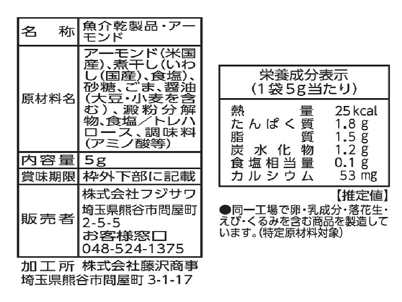 特徴:香ばしくローストしたアーモンドとおいしく味付した小魚をミックスしました。
