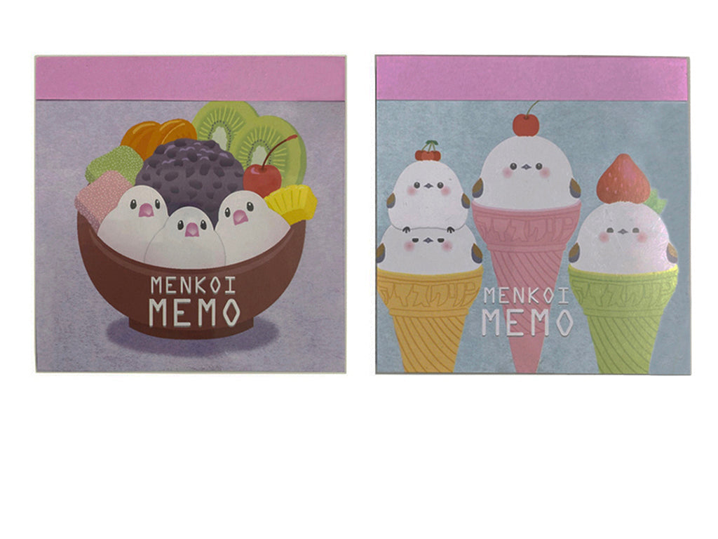 透明カバーがついたファンシー柄のメモパッド。100枚。文鳥とシマエナガのアソート。小型で使いやすい正方形です。紙で手をきらないようにご注意ください。