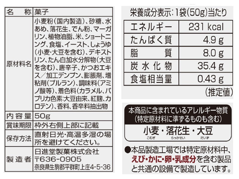 特徴:ピーナッツ・クラッカー・かりんとう・あられをミックスした和風スナックです。