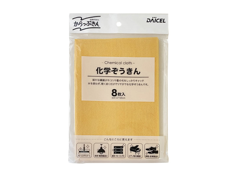 細かな繊維がホコリや髪の毛をしっかりキャッチ 水を使わず、軽く拭くだけでツヤがでる化学ぞうきんです。 こんなところに使えます フローリングワイパーに 証明・電気製品に 家具・フローリングに ピアノ等の楽器に 革靴・皮革製品に家具、フローリングなどの床、電気製品、ピアノなどの楽器、オーディオ製品、皮革・合成皮革製品、自動車内・外 細かい繊維なので、ホコリや髪の毛などの汚れを絡めとり、しっかり吸着します。 着塵剤配合でホコリがたちにくく衛生的にお掃除ができます。 からっぷきんは、水のいらない化学ぞうきんです。家中のお掃除にとても便利です。 シートは両面使えて経済的です。 品名:化学ぞうきん 材質:不織布(ポリエステル) サイズ:27cmx20cm 入数:8枚 主成分:流動パラフィン ①力を入れずに軽く汚れを拭き取ってください。 ②シートの両面を使い終わったら、燃えるごみとして捨ててください。火の近くに置いたり、火の近くで使用したりしないでください。 幼児の手の届く所に置かないでください。