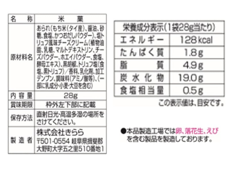 特徴:贅沢なトリュフ風味香る黒胡椒仕立ての塩カマンベールチーズクリームをあられにたっぷり詰めました。